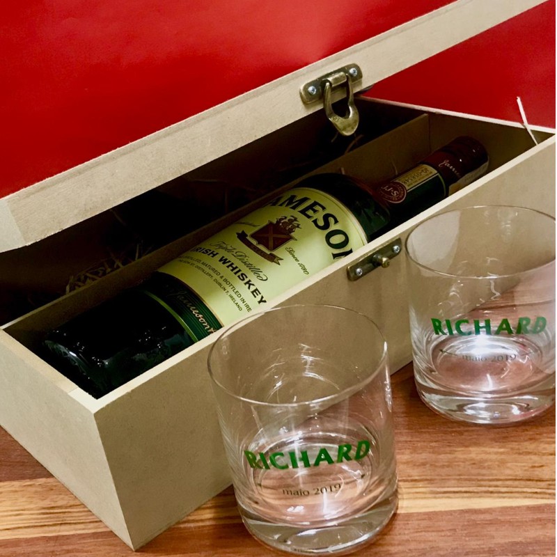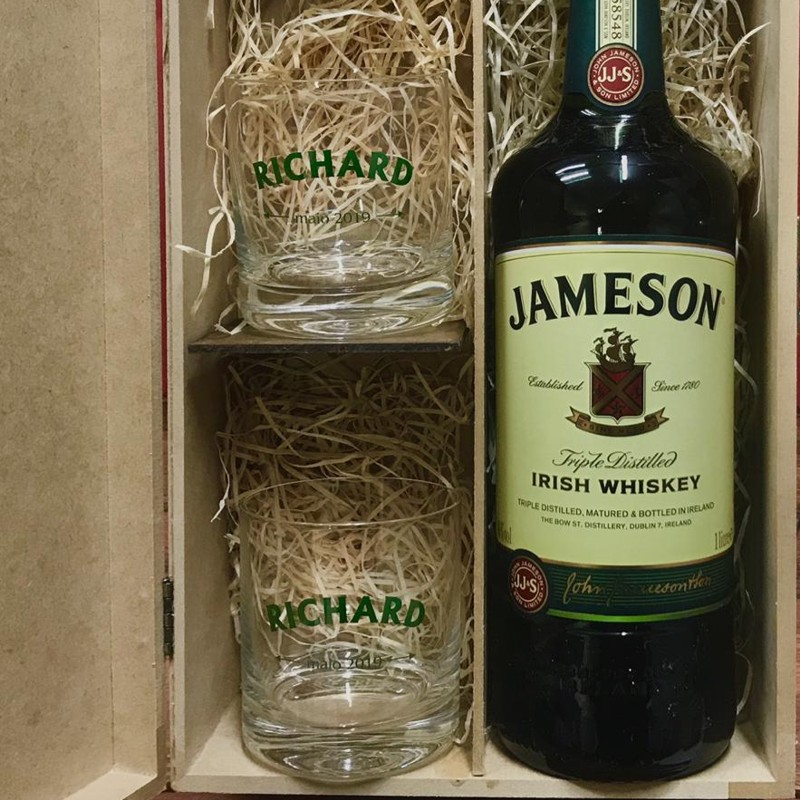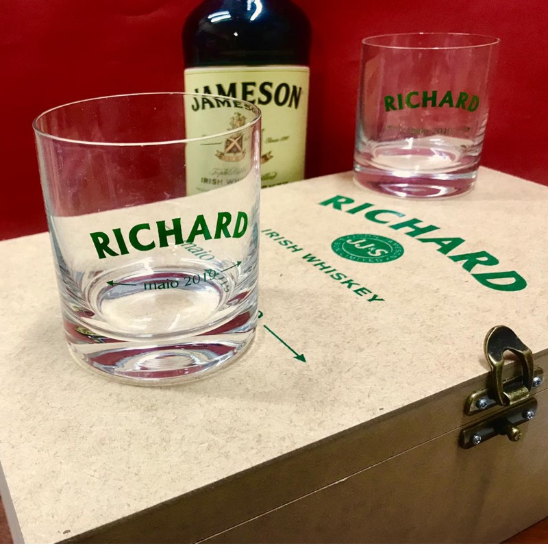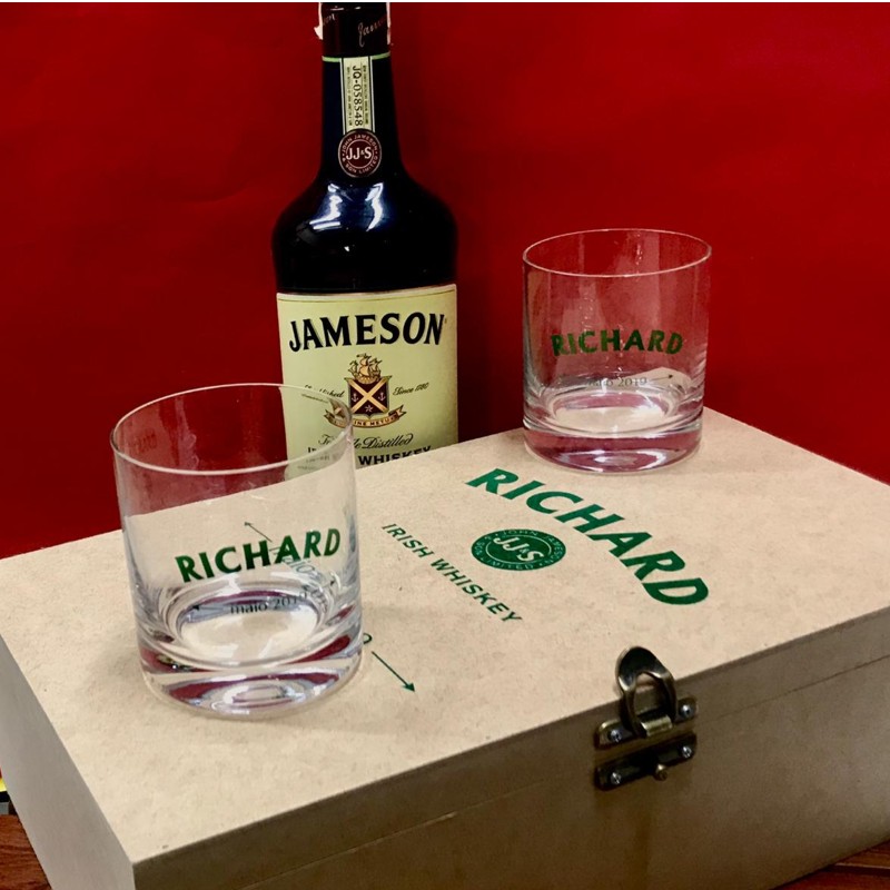 Caixa mdf – 2 copos cristal – whiskey Jameson